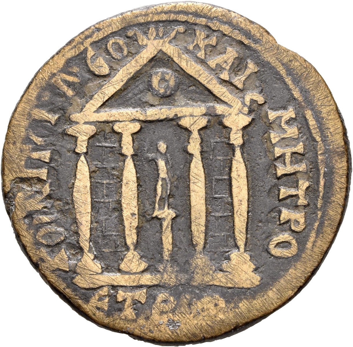 temple with four columns with walls within intercolumnations within which male figure on pedestal standing facing, head right, resting on sceptre; pellet in pediment |