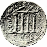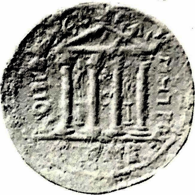temple with four columns with with door closed decorated with bust and door knocker in the centre and male figures standing on pedestal, left and right; pellet in pediment |
