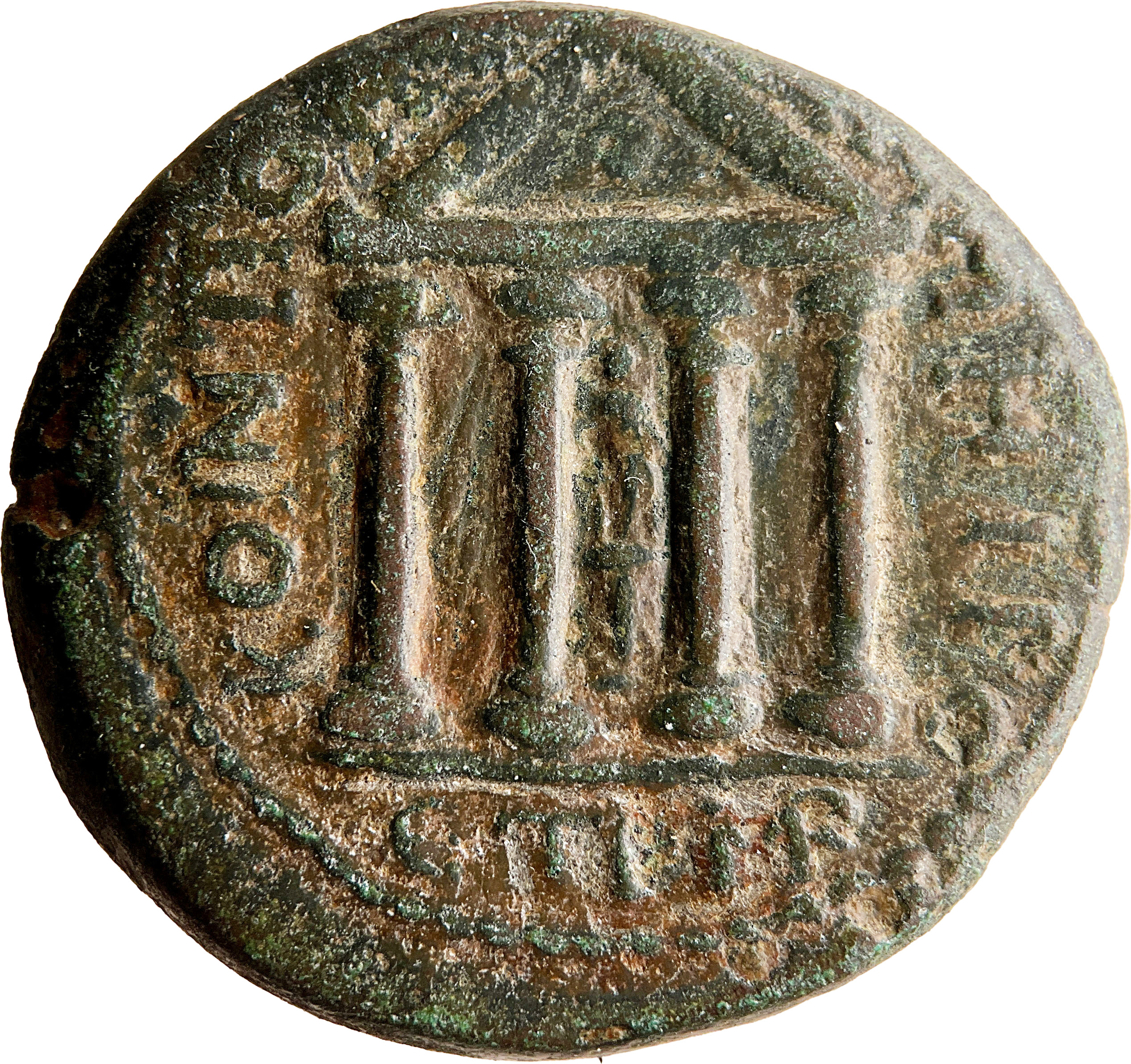 temple with four columns with male figure standing on pedestal in the centre, head right; pellet in pediment