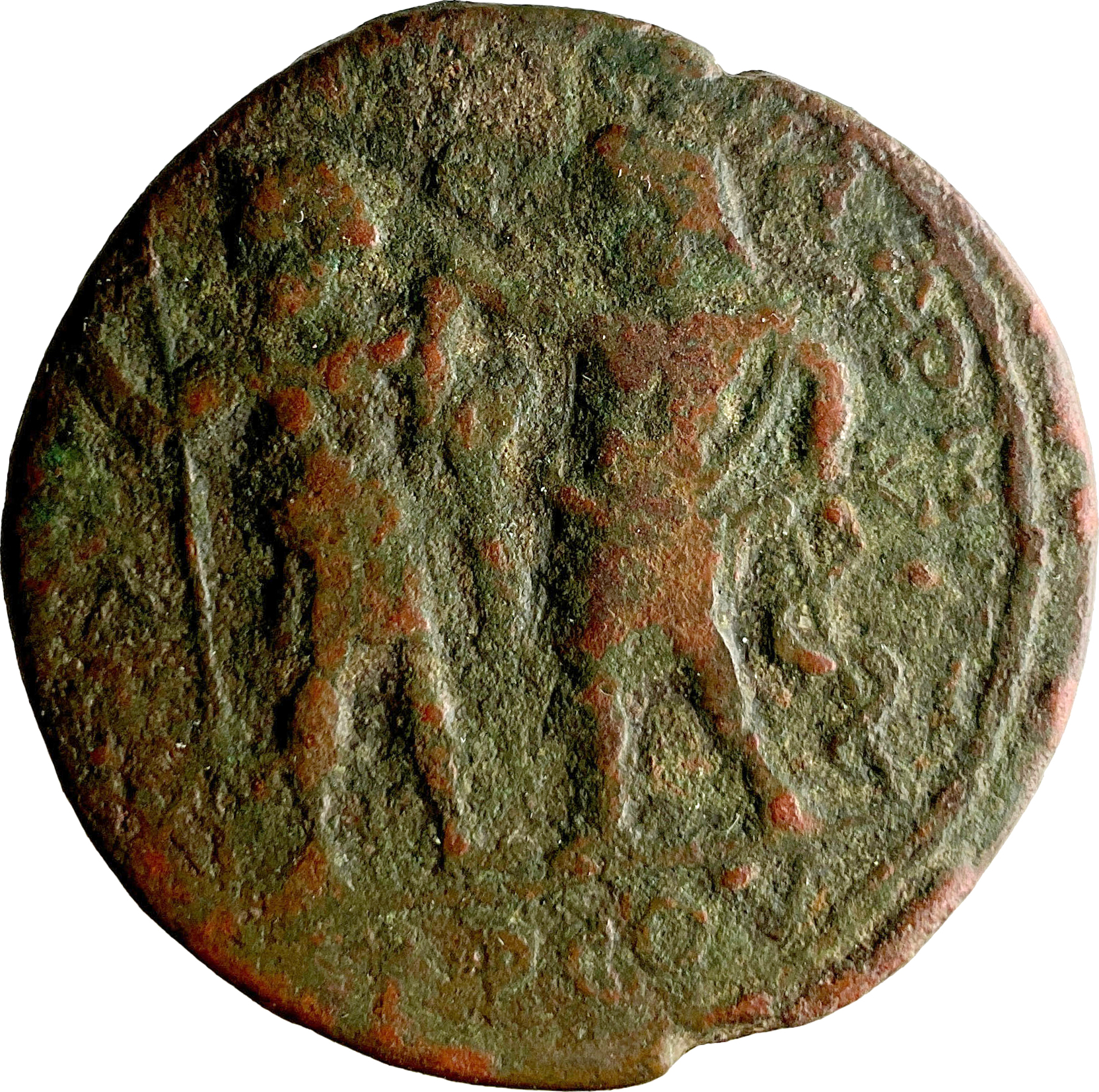 Caracalla standing facing, head left (?), holding spear (?), and Asclepius standing facing, head left, hand raised, holding serpent staff; below, star