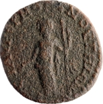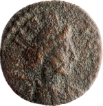 draped bust of Tyche, right, wearing turreted crown; thyrsus on left shoulder