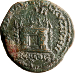 building with door; at top, three statues of Demeter carrying torches; on either side, flaming torch entwined by serpent