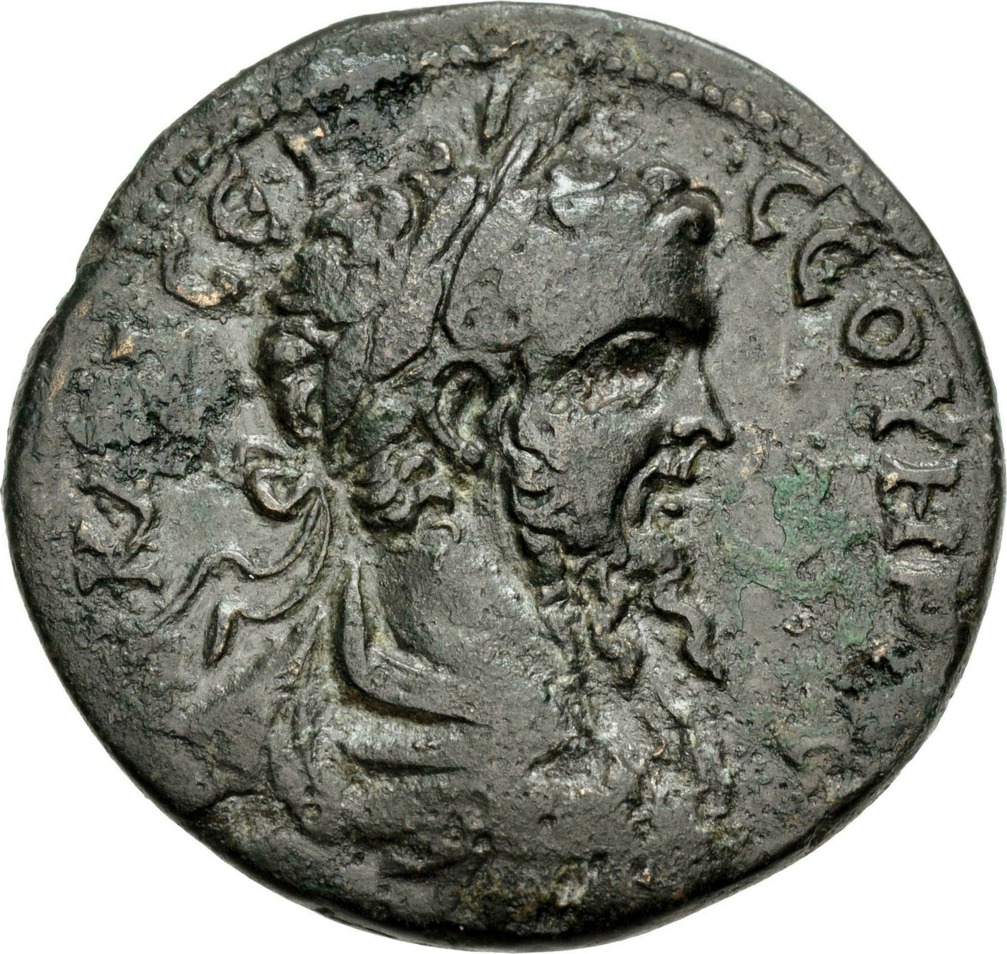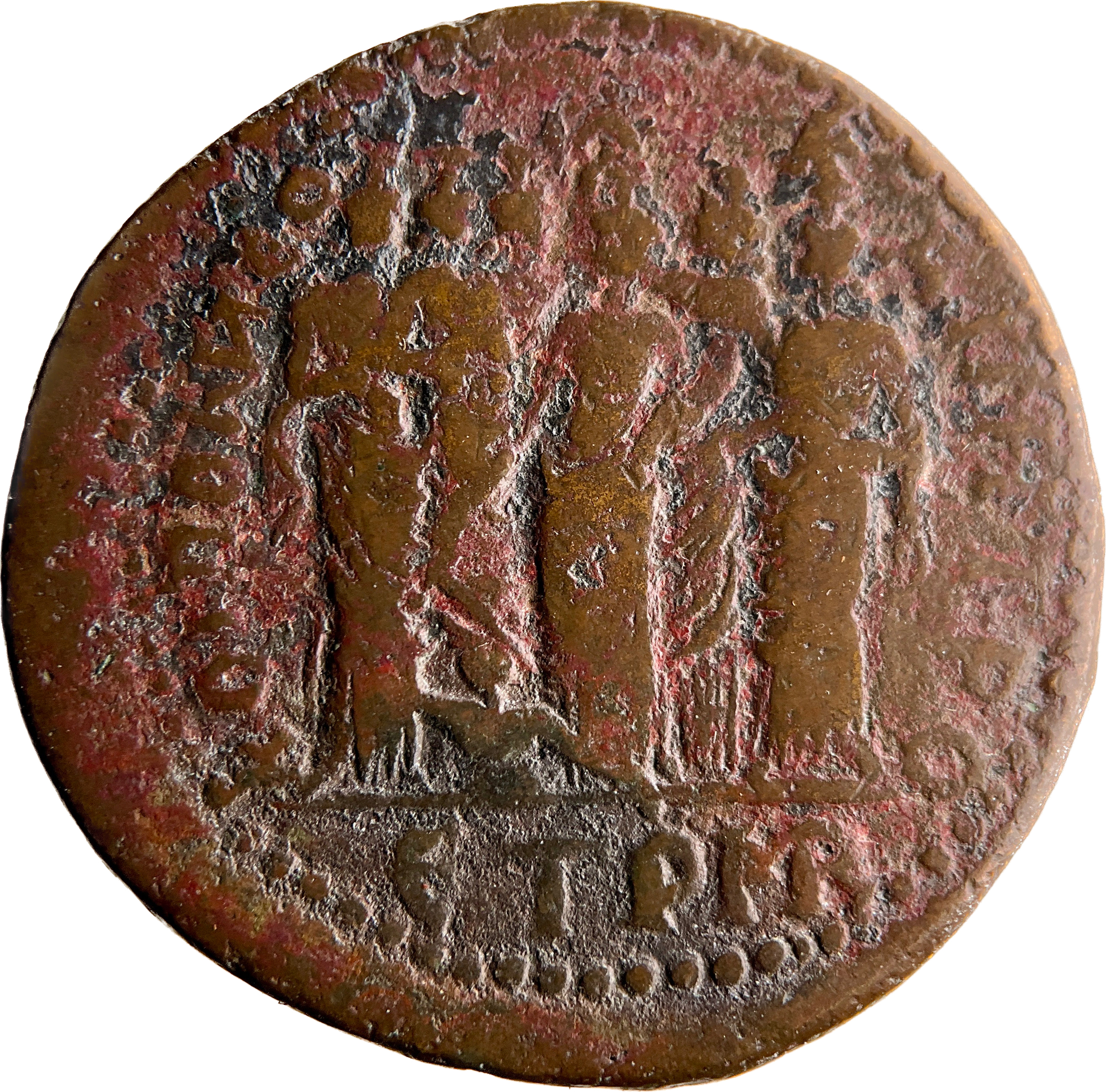 Tyche of Neocaesarea, turreted and draped, standing facing, head left, holding rudder and cornucopia; at her feet, river god Lykos swimming; to the left, three Tychai standing right, and to the right, two Tychai standing left, all turreted and draped |