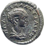 Demeter veiled standing facing, head left, holding ears of corn in her right hand and resting on lighted torch with her left