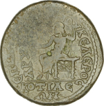 Zeus seated left, holding patera and sceptre |