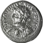 laureate and cuirassed bust of Caracalla, left, seen from front, holding spear in his right hand and shield (ornated with gorgoneion) on his left arm