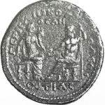 female deity seated right, holding ? in her right hand and cornucopia in her left facing Zeus seated left, holding patera and resting on sceptre