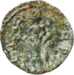 Genius standing left, holding Victory and cornucopia; to left, altar