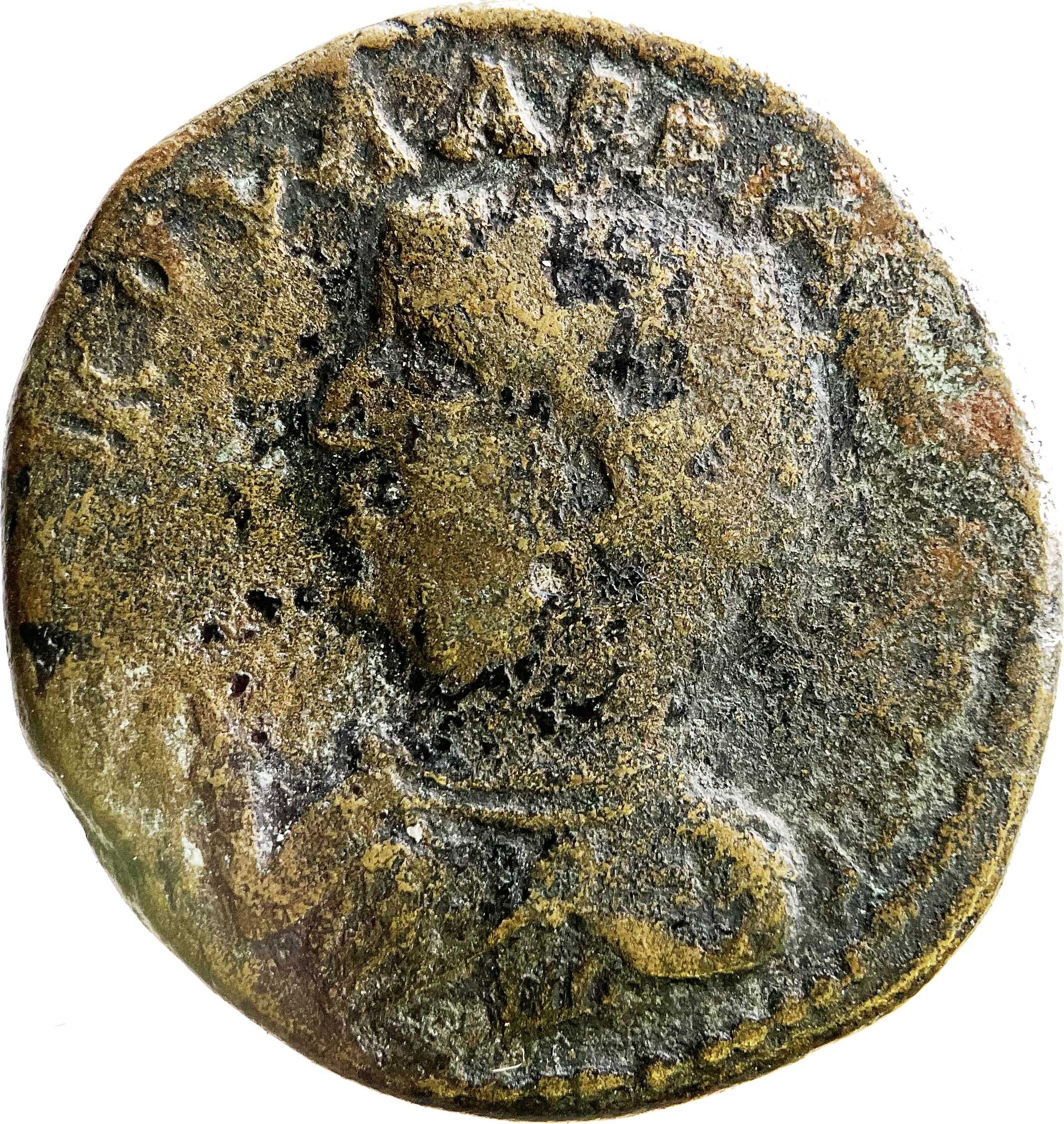 radiate and cuirassed bust of Valerian, left, seen from rear, raising hand and holding spear over shoulder