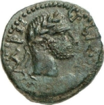 radiate figure, holding a shield and a spear, on facing biga on top of two-storied monument; behind, wall, flanked on either side by a column surmounted by a standing figure, each holding a spear