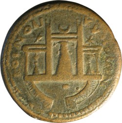 temple of Aphrodite at Palaipaphos, in which canonical xoanon with star on either side; crescent and star above roof; candelabrum in side chambers, doves above; paved semicircular walled courtyard