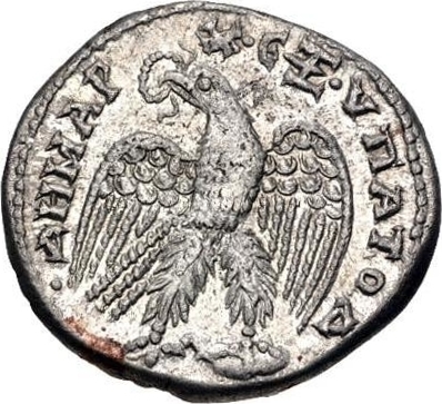 eagle standing facing, wings spread, head left, wreath in beak, standing on leg and thigh of sacrificial animal