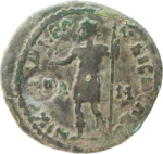 emperor in military dress standing facing, head left, resting on spear with his left