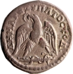 eagle standing facing, wings spread, head and tail left, wreath in beak; below, torch with serpent entwined, right