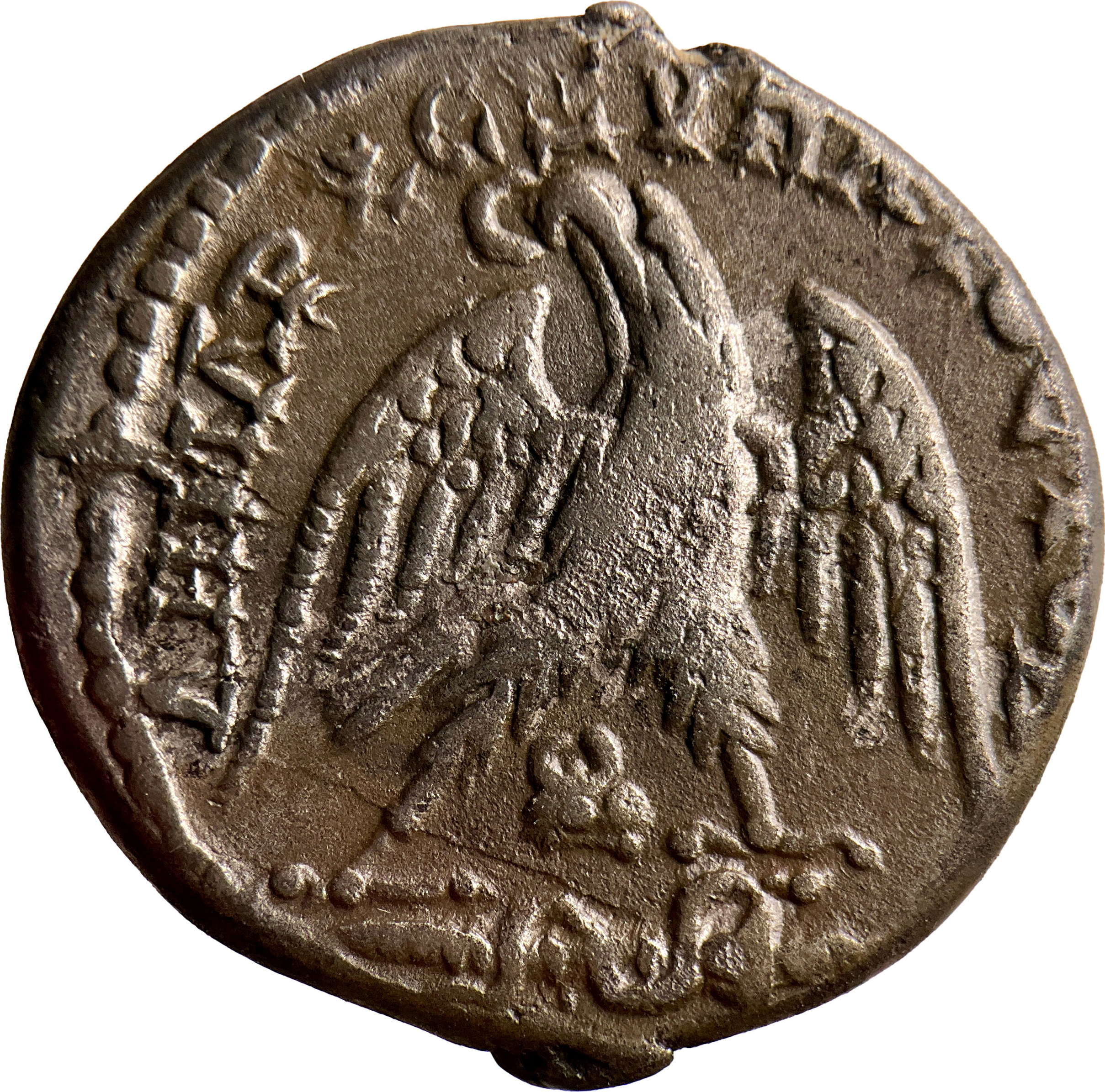 eagle standing facing, wings spread, head and tail left, wreath in beak; below, torch with serpent entwined, right; between eagle's legs, bull's head right