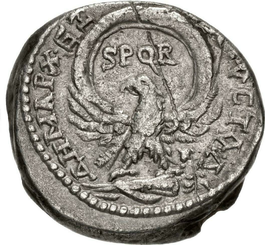 eagle standing facing, head left, spreading wings to support wreath inscribed S P Q R; below, torch with serpent entwined, right; bull's head in lower right field.