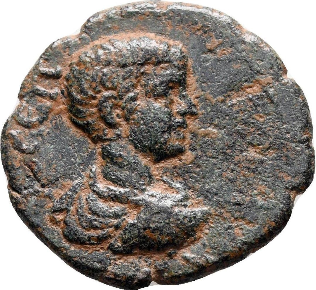 bare-headed, draped and cuirassed bust of Geta, right, seen from rear