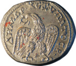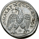 eagle standing facing, wings spread, head left, wreath in beak; between legs, star