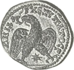 eagle standing facing, wings spread, head left, wreath in beak; between legs, star
