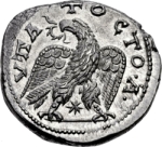 eagle standing facing, wings spread, head left, wreath in beak; between legs, star