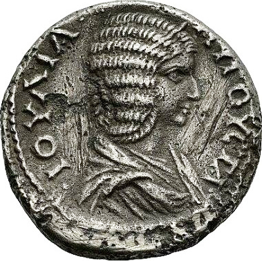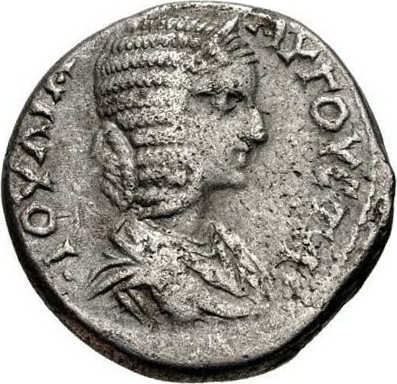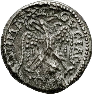 eagle standing facing, head left, wings spread, wreath in beak; between eagle's legs, radiate, draped and cuirassed bust of Shamash, left