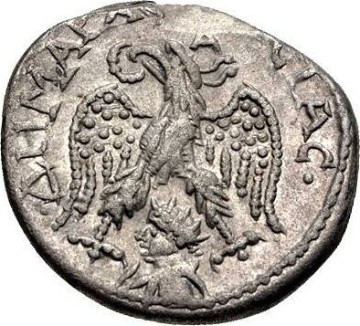 eagle standing facing, head left, wings spread, wreath in beak; between eagle's legs, radiate, draped and cuirassed bust of Shamash, left