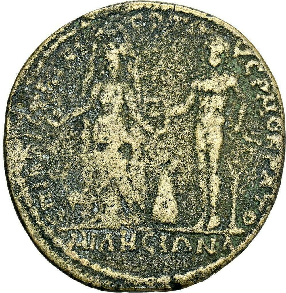 Artemis standing facing, wearing kalathos, veiled and draped, holding patera over stag and bow, and Apollo standing facing, holding stag and bow; at feet, branch |