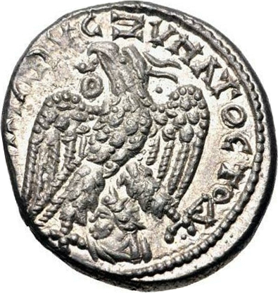 eagle standing facing, head left, wings spread, wreath in beak; between eagle's legs, radiate, draped and cuirassed bust of Shamash, left