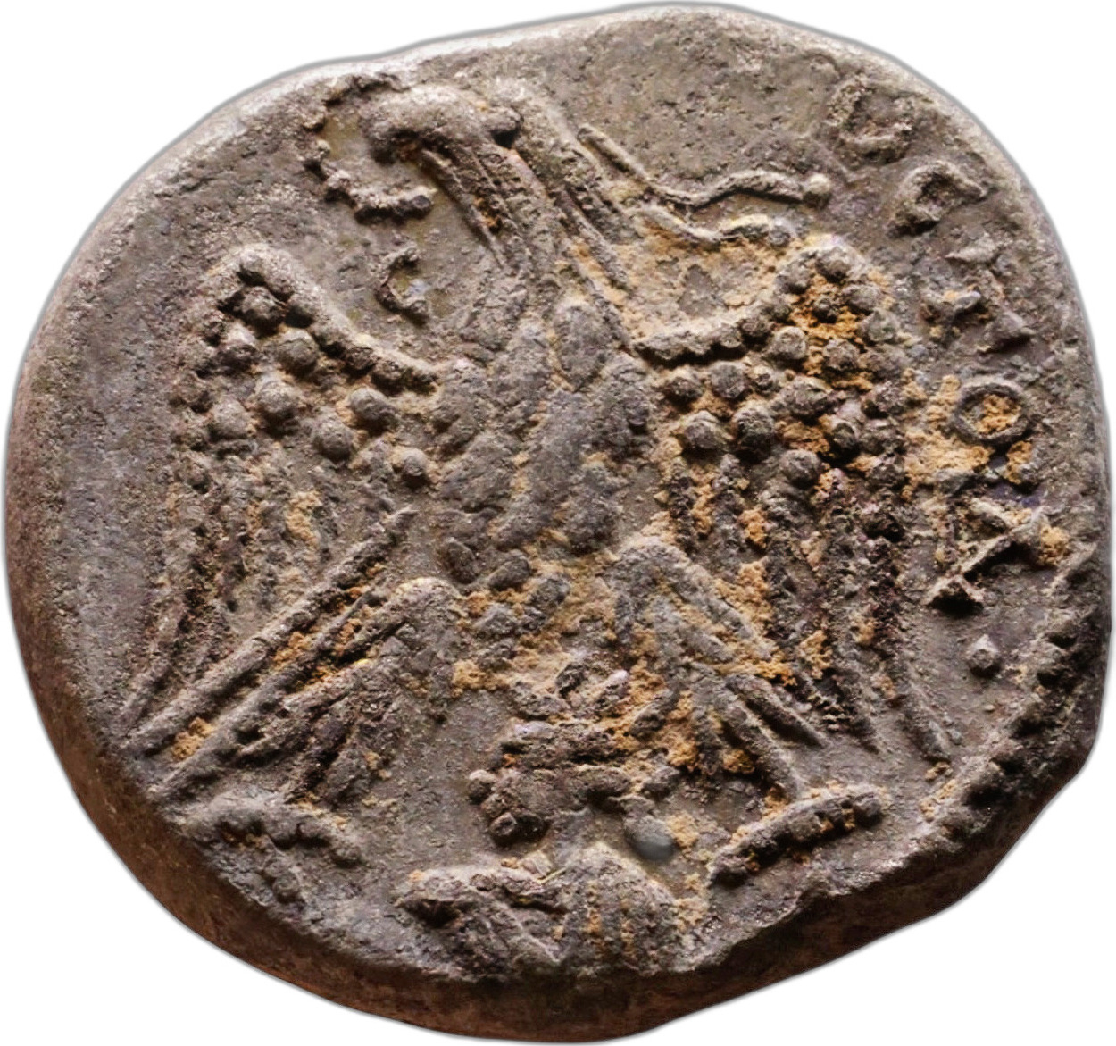 eagle standing facing, head left, wings spread, wreath in beak; between eagle's legs, radiate, draped and cuirassed bust of Shamash, left