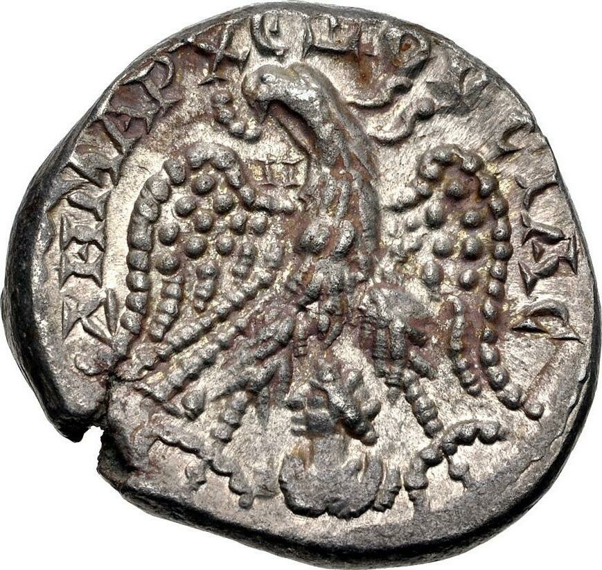 eagle standing facing, head left, wings spread, wreath in beak; between eagle's legs, radiate, draped and cuirassed bust of Shamash, left