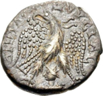 eagle standing facing, head left, wings spread, wreath in beak; between eagle's legs, radiate, draped and cuirassed bust of Shamash, left