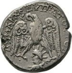 eagle standing facing, head left, wings spread, wreath in beak; between eagle's legs, radiate, draped and cuirassed bust of Shamash, left