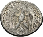 eagle standing facing, head left, wings spread, wreath in beak; between eagle's legs, radiate, draped and cuirassed bust of Shamash, left