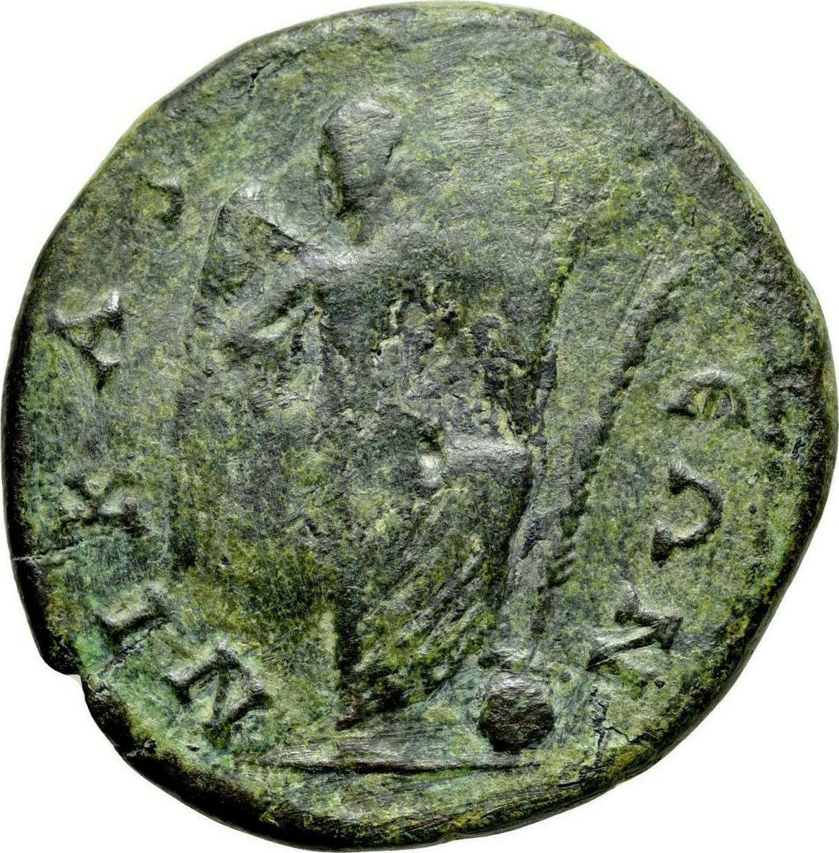 Nike standing facing, head left, foot on globe on top of which a palm, holding parazonium ? in her left