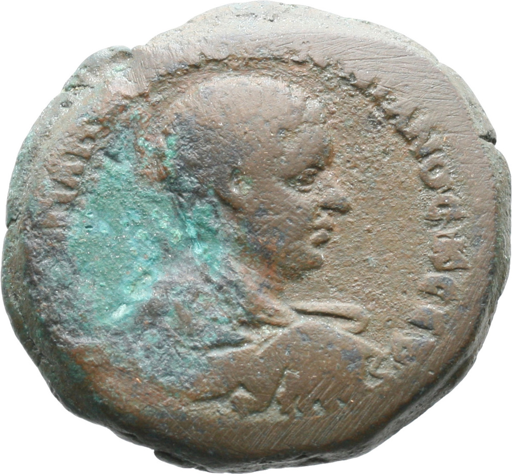 bare-headed, draped and cuirassed bust of Diadumenian, right, seen from rear |