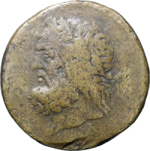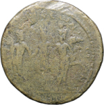 Pisidian moon-goddess standing facing, crescent on head, between the two Dioscuri, each holding spear, next to their horses