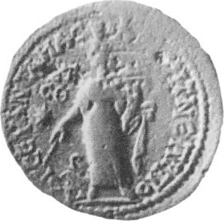 Tyche standing facing, head left, holding rudder in right and cornucopia in left; in right field, star |