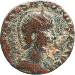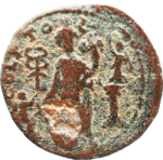 Tyche standing facing., crowned by Victory on column behind her; to left, winged caduceus; to left, small figure of Marsyas