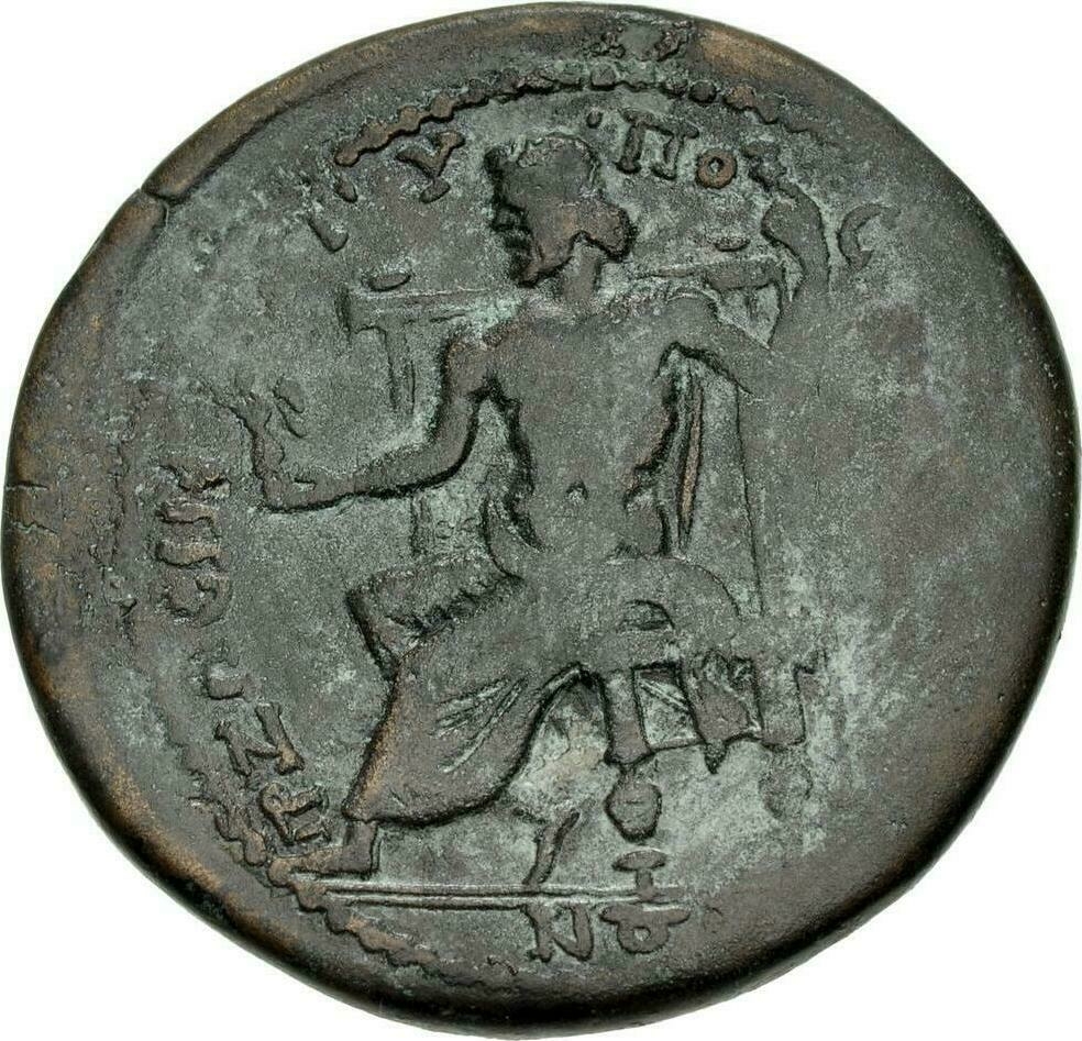 Zeus seated left, himation over lower limbs and left shoulder, holding statue of Nike in extended right hand, left resting on sceptre
