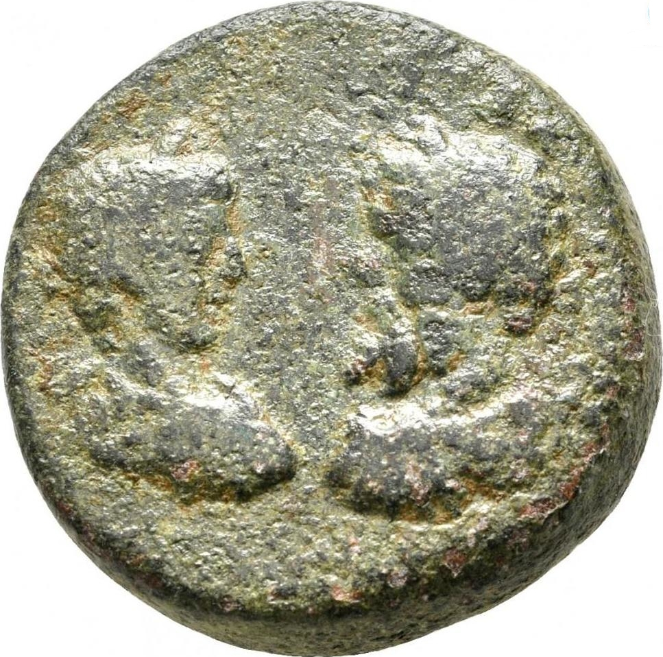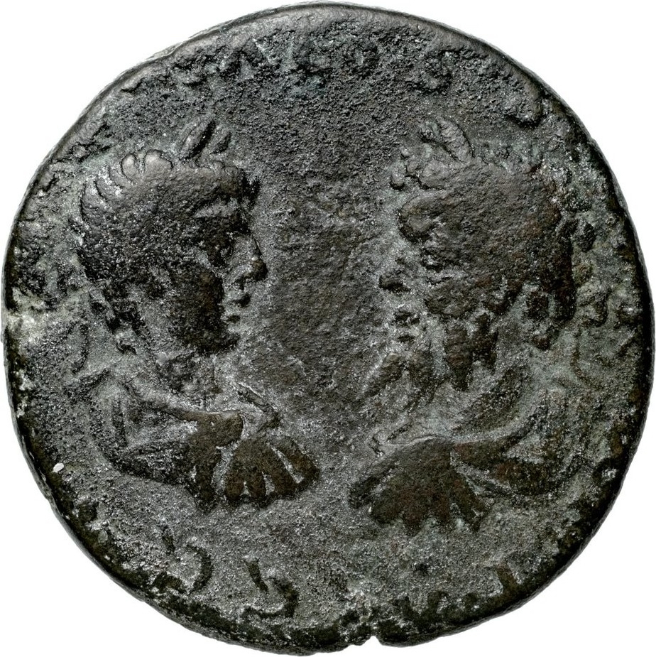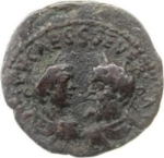 Obverse design laureate, draped and cuirassed bust of Caracalla, right, seen from rear, facing laureate, draped and cuirassed bust of Septimius Severus, left, seen from rear