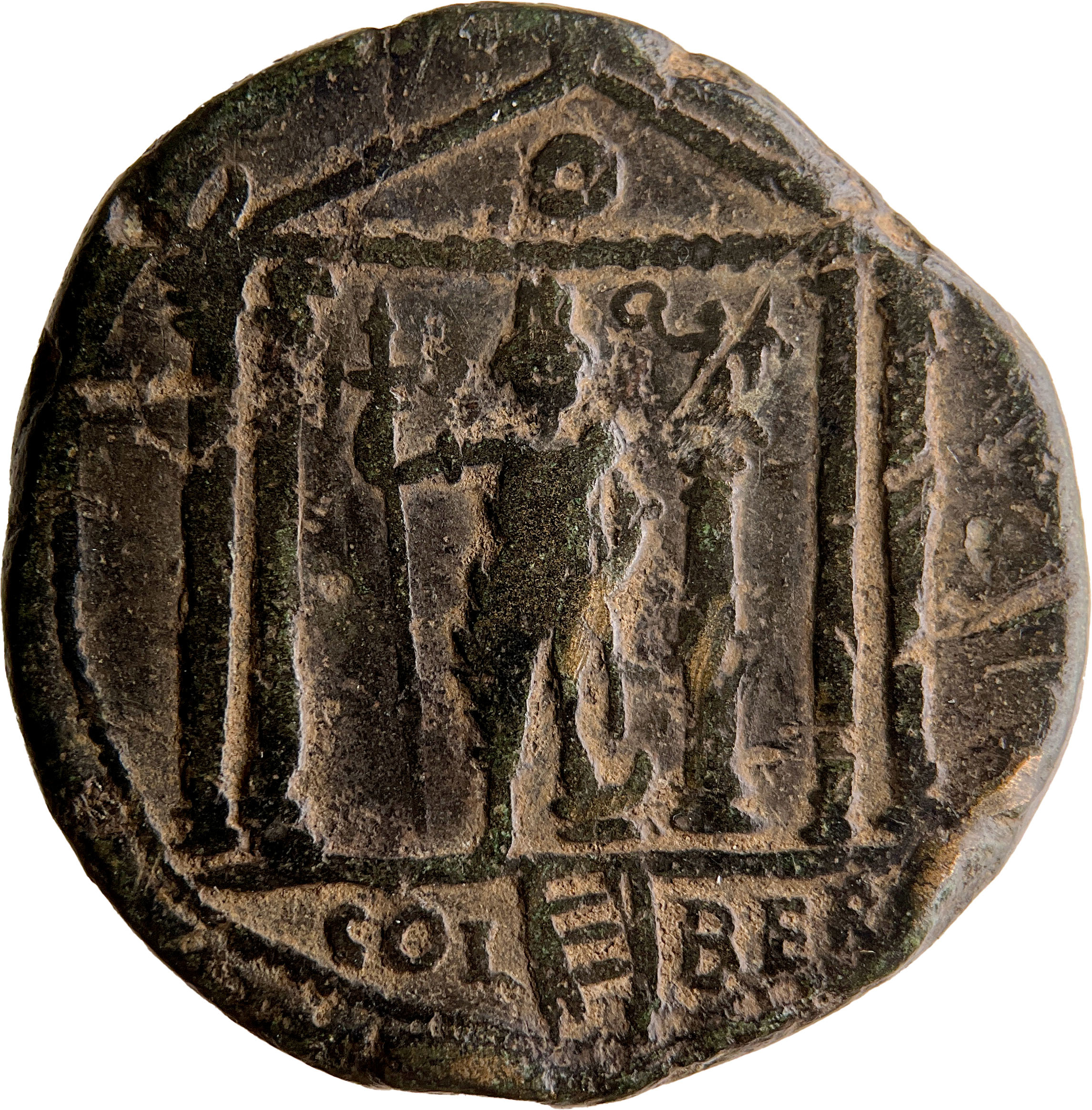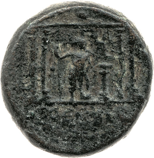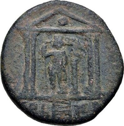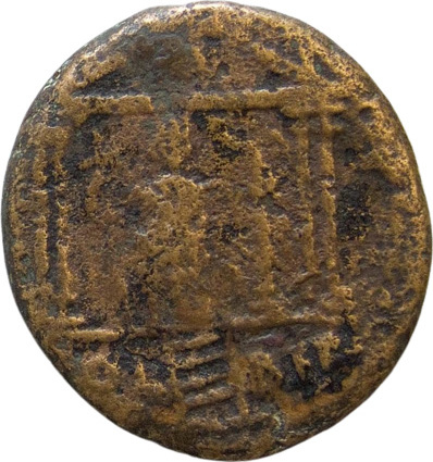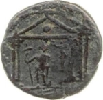Reverse design temple with four columns with steps leading up to it, pellet in pediment, with cult statue of Astarte turreted, standing facing within, holding aphlaston in her right hand, her left foot standing on prow; to right, column surmounted by Nike, crowning Astarte