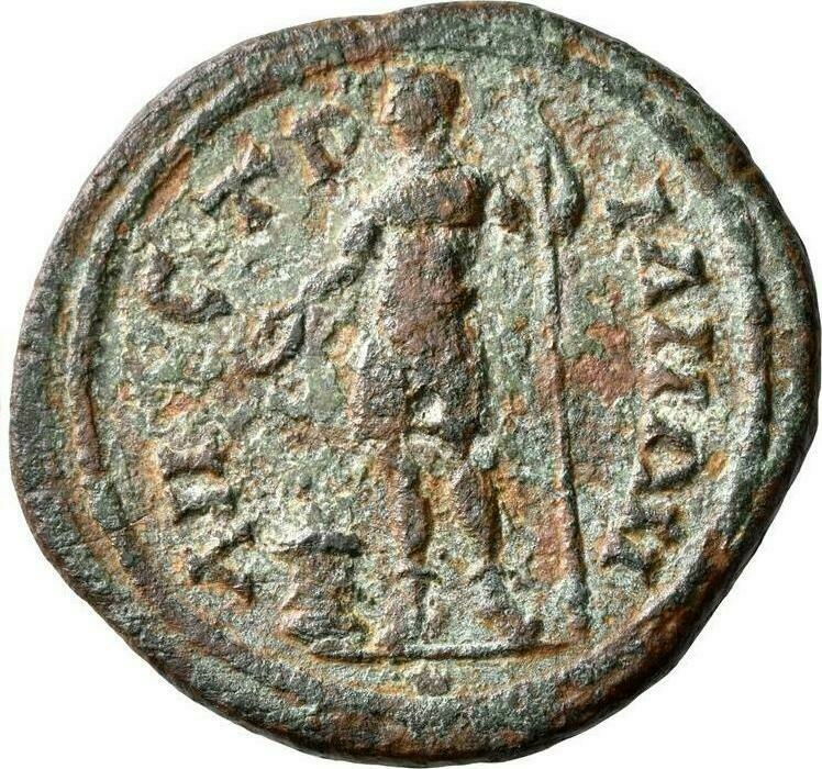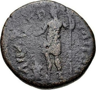 emperor (Caracalla) in military dress standing facing, head left, holding patera over lighted altar and resting on sceptre