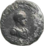 bare-headed, draped and cuirassed bust of Diadumenian, right, seen from front |