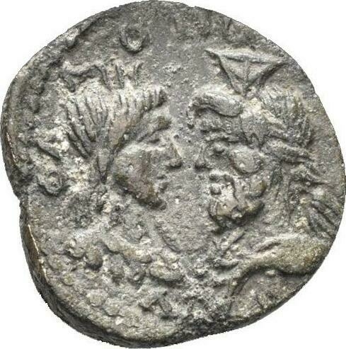 facing busts of Sarapis, draped and wearing kalathos, right, and Isis, wearing basileion, left |
