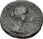 Athena, helmeted, standing facing, head left, holding Nike and spear.
