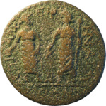 Apollo standing, facing, head, right, holding patera, resting arm on hip; to right, Dionysus standing, facing, head, left, holding cantharus over lighted altar and long thyrsus; (between above, crescent with horns upwards)