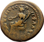 Homonoia (?) wearing kalathos seated left, holding patera and cornucopia; at her feet, unidentified figure