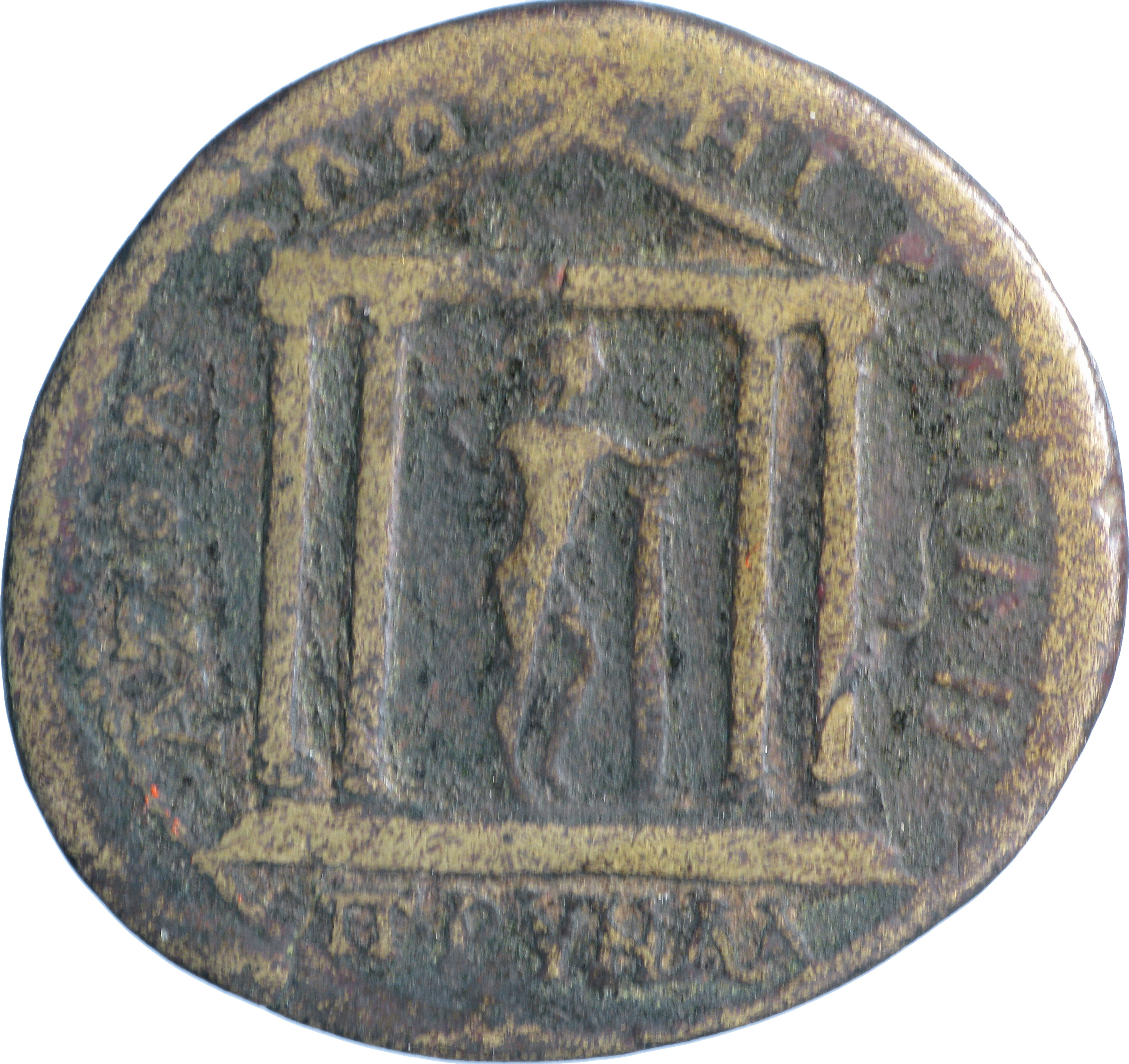 temple with four columns enclosing Apollo, nude, standing right, holding arrow, left elbow resting on pillar