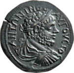 Emperor (Caracalla) in military dress, standing facing, head right, holding spear in right hand and parazonium in left hand
