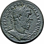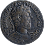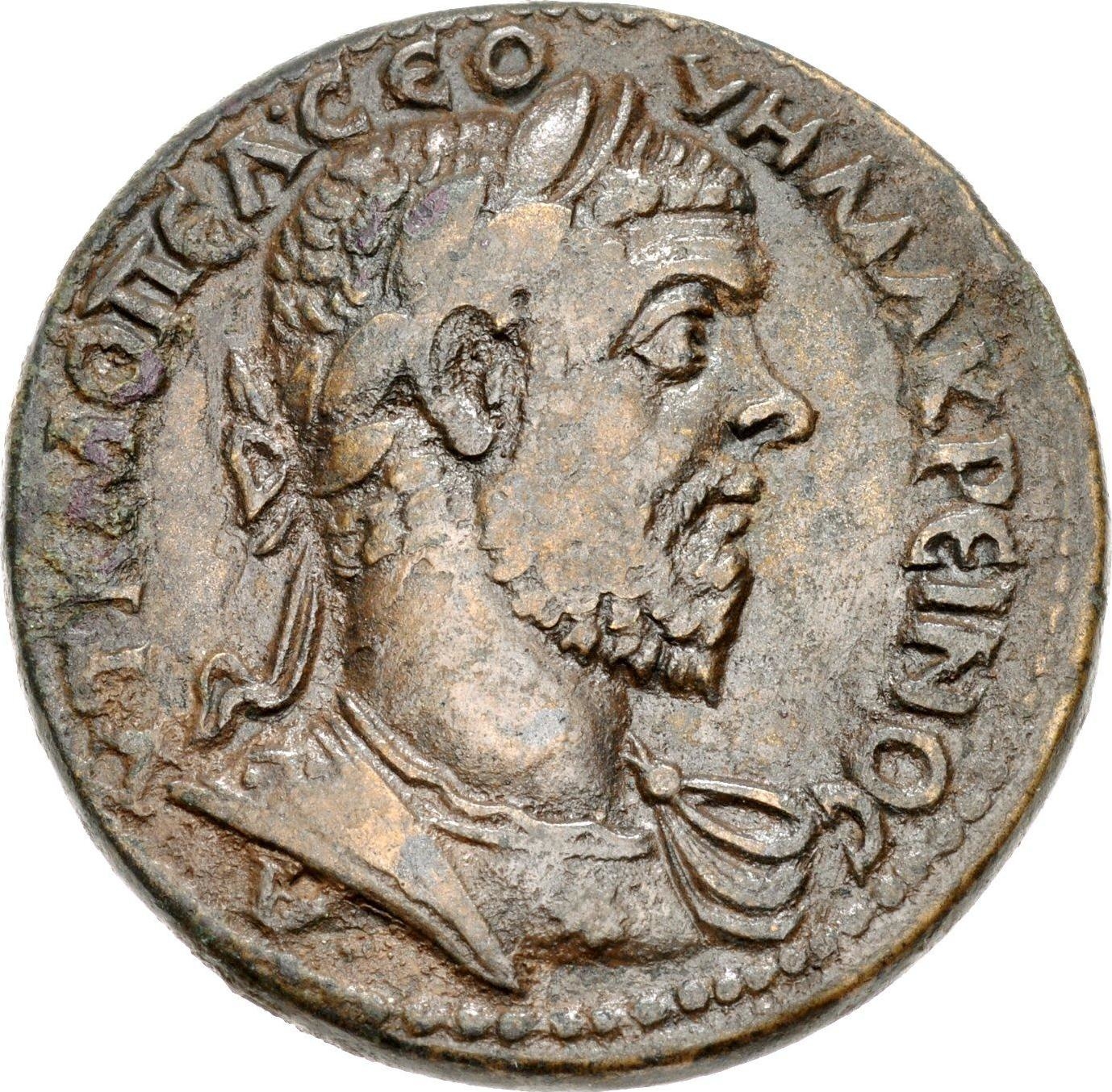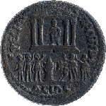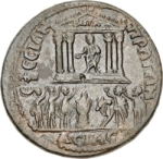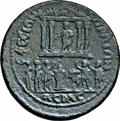 temple with four columns enclosing statue of Macrinus standing left; in the center, below, altar and humped bull for sacrifice; on each side, figures standing raising right arm |